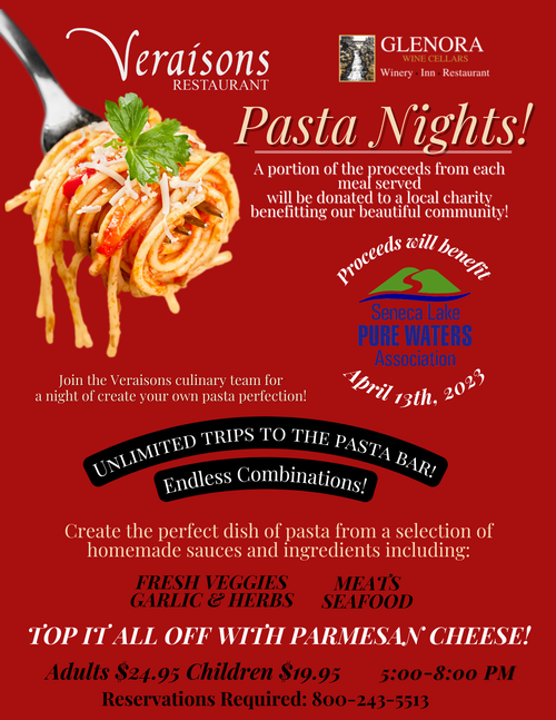 We're thrilled to announce our upcoming Pasta Night—where a portion of the proceeds from each meal served will be donated to Seneca Lake Pure Waters Association! Join us for a culinary adventure where you will have the chance to make your own creative combination of pasta. Craft the perfect dish from a selection of homemade sauces and ingredients including Meats, Seafood, Fresh Veggies, and Garlic & Herbs! The combinations are endless!